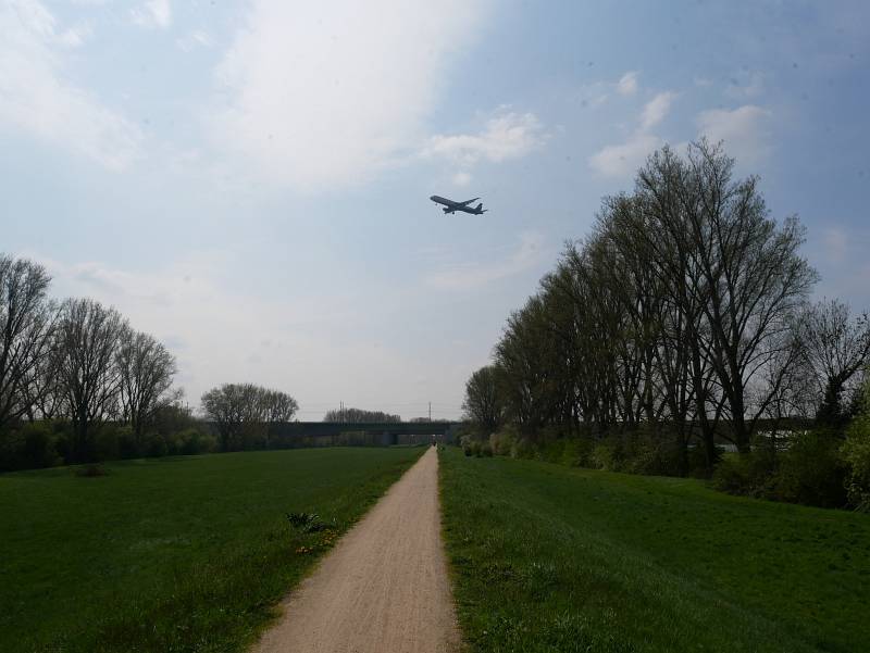 Dass sich der Frankfurter Flughafen in unmittelbarer Nähe befindet und man unter der Einflugschneise "hindurchläuft", ist unverkennbar - teilweise ist mein Weg nur wenige hundert Meter vom Flughafengelände entfernt. Flugzeug um Flugzeug setzte zur Landung an - und doch sind die Passagiere jedes einzelnen Flugzeuges zu spät und haben das gestrige Top-Spiel der Regionalliga Südwest verpasst. Vermutlich haben viele der vorbeifliegenden Passagiere während ihres Fluges auch weniger km zurückgelegt, als ich während meiner kompletten Tour. Schließlich wären es selbst nach Barcelona, Belgrad oder Rom von Frankfurt aus weniger als 1.400 km.
