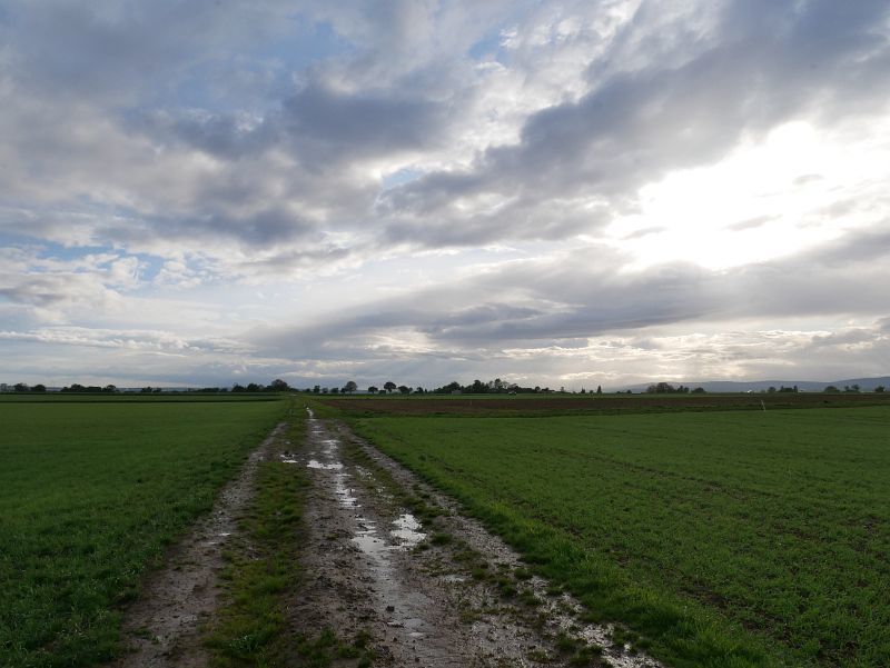 Unspektakulär war ab Mainz-Kastel der weitere Wegverlauf, der meist schnurstracks geradeaus führte. Bewusst entschied ich mich für diese Route, da es die kürzeste und einfachste Möglichkeit war, zu Fuß nach Hofheim am Taunus zu gelangen. Da am nächsten Tag eine anspruchsvollere Tagestour anstand und ich logischerweise erst nach Spielende am Mainzer Stadion loslaufen konnte, war das Haupt-Kriterium für die Route hier die Einfachheit. Kurz vor Delkenheim konnte ich dann nochmals etwa 500 m Weg einsparen, als ich etwa 600 m auf der recht stark befahrenen L3028 lief. Das mag für die Autofahrer nicht optimal sein, da sie bei Gegenverkehr doch etwas eingebremst wurden - doch die Straße gehört ja allen Verkehrsteilnehmern gleichermaßen - auch Fußgängern. Es sollte auch der am stärksten befahrene Straßenabschnitt während der gesamten Regionalliga-Tour sein, welchen ich ohne Fußweg auf der Straße zurücklegen musste. Unangenehm war, dass kurz vor Delkenheim Starkregen einsetzte. Da ich mich in einen Supermarkt "flüchten" konnte, war ich dem Starkregen nur kurz ausgesetzt.